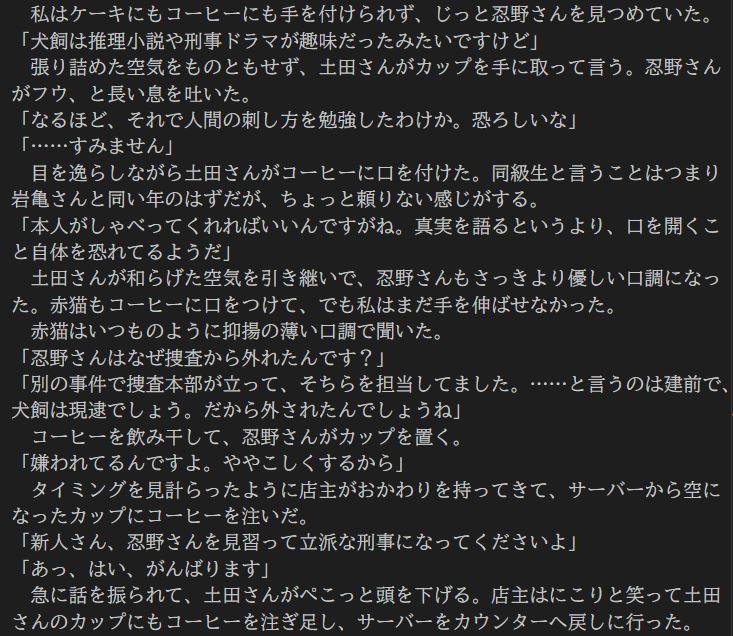 探偵の赤井小虎と助手の犬飼美沙緒の出会いをえがいた始まりの物語なので、ゲーム未プレイのかたもお気軽にどうぞ。ゲーム時点を現在とすると、2年前の話です。