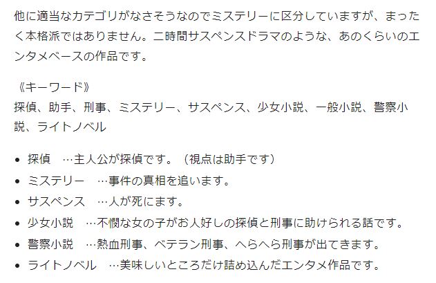 「父親が殺人犯になった」という非常に真面目な入りですが展開はエンタメです。恋愛要素というほどの恋愛要素もなく、ただ美沙緒の一人称で進むのでやや少女小説寄りではないかと思います。ミステリーをエッセンスにしたエンタメ小説です。