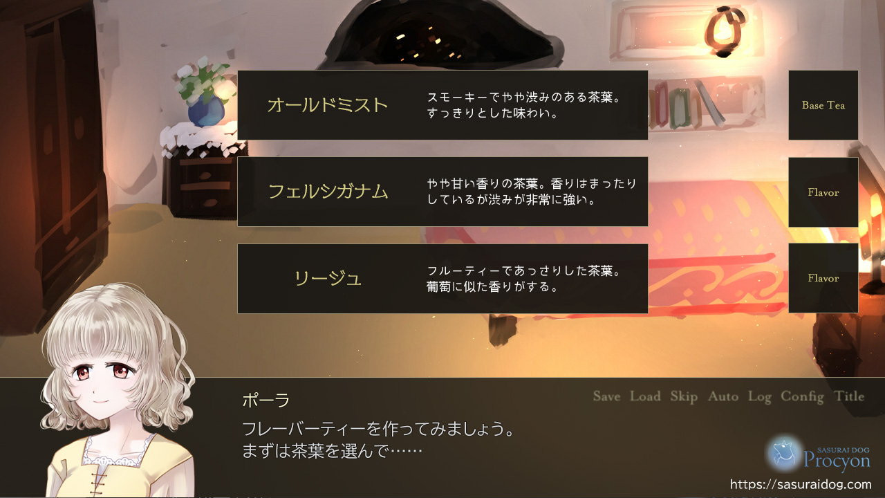 素材を選んでフレーバーティーを作る1周 ~5分程度、エンド全14種のミニゲームです。素材の組み合わせによってイベントが変化します。
