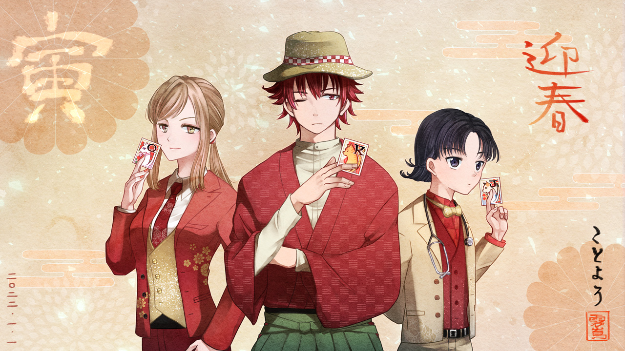 赤井、緑、美沙緒、さてそれぞれ誰の役かしら、ということで、年賀絵は推理してお楽しみください。