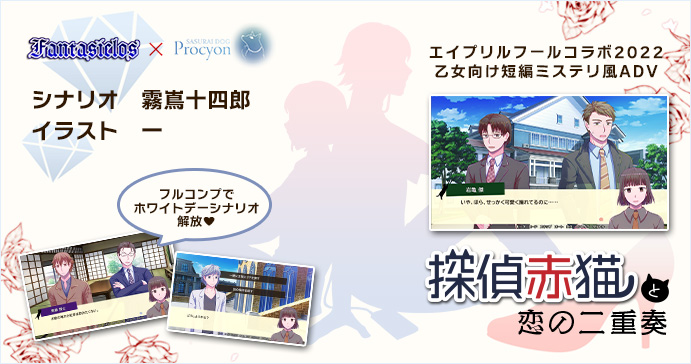 2021年のエイプリルフールコラボADV「探偵赤猫 楽園からの挑戦状」のブラウザ版およびノベルゲームコレクションさんでの公開を1月末日で終了しました。ダウンロード版については引き続き自サイトおよびBOOTHにて公開中です。