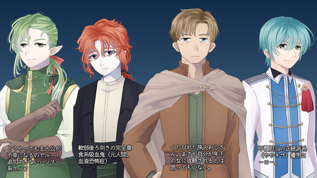 そんな具合でぼちぼちとキャラクター紹介更新していけるかなと…。サブキャラクター(メンズ)は左端のエルフ(フォルテ)を除いて、シェア版で個別ルート追加予定です。