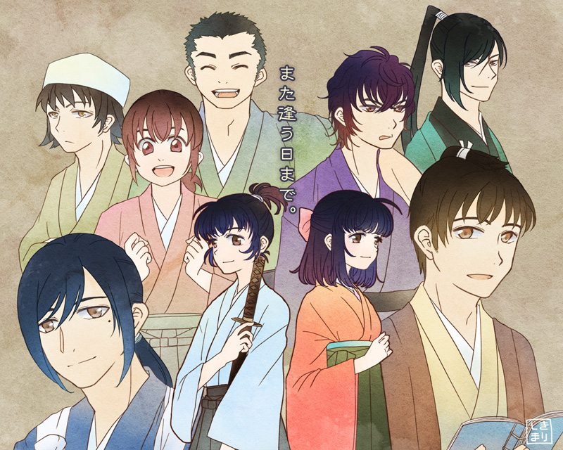結局バージョンアップはほとんどできないまま公開終了を迎えましたが、最後くらいと集合イラストを描いてみました。時代の移り変わりを意識して、かなえは幕末verと明治verです。配置も幕末側と明治側で分けてみました。