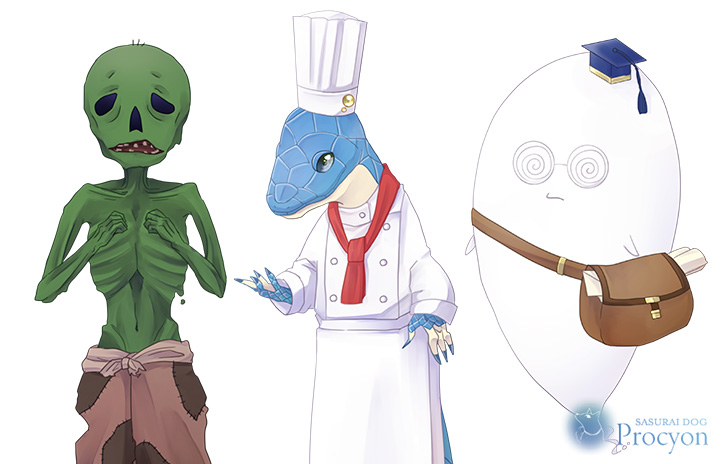 谷底の仲間たち 左からゾンビ、リザードマンのコック、ゴースト